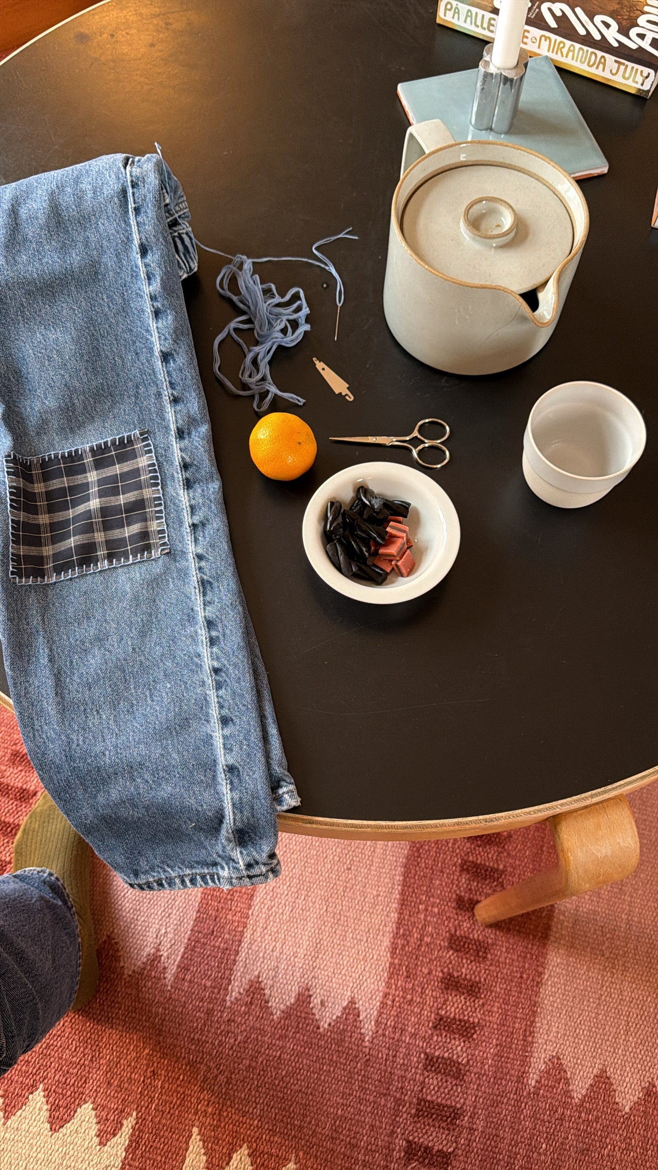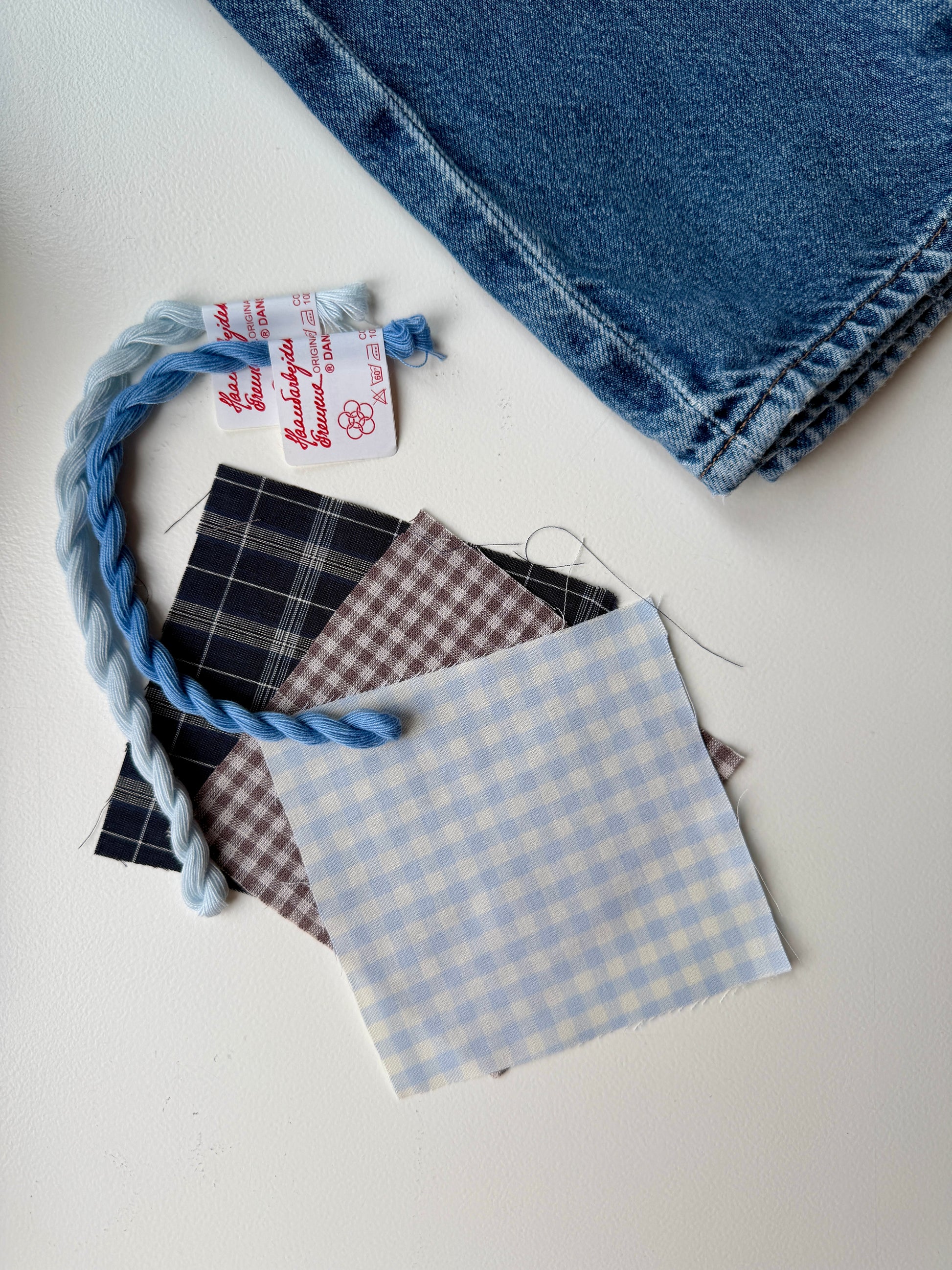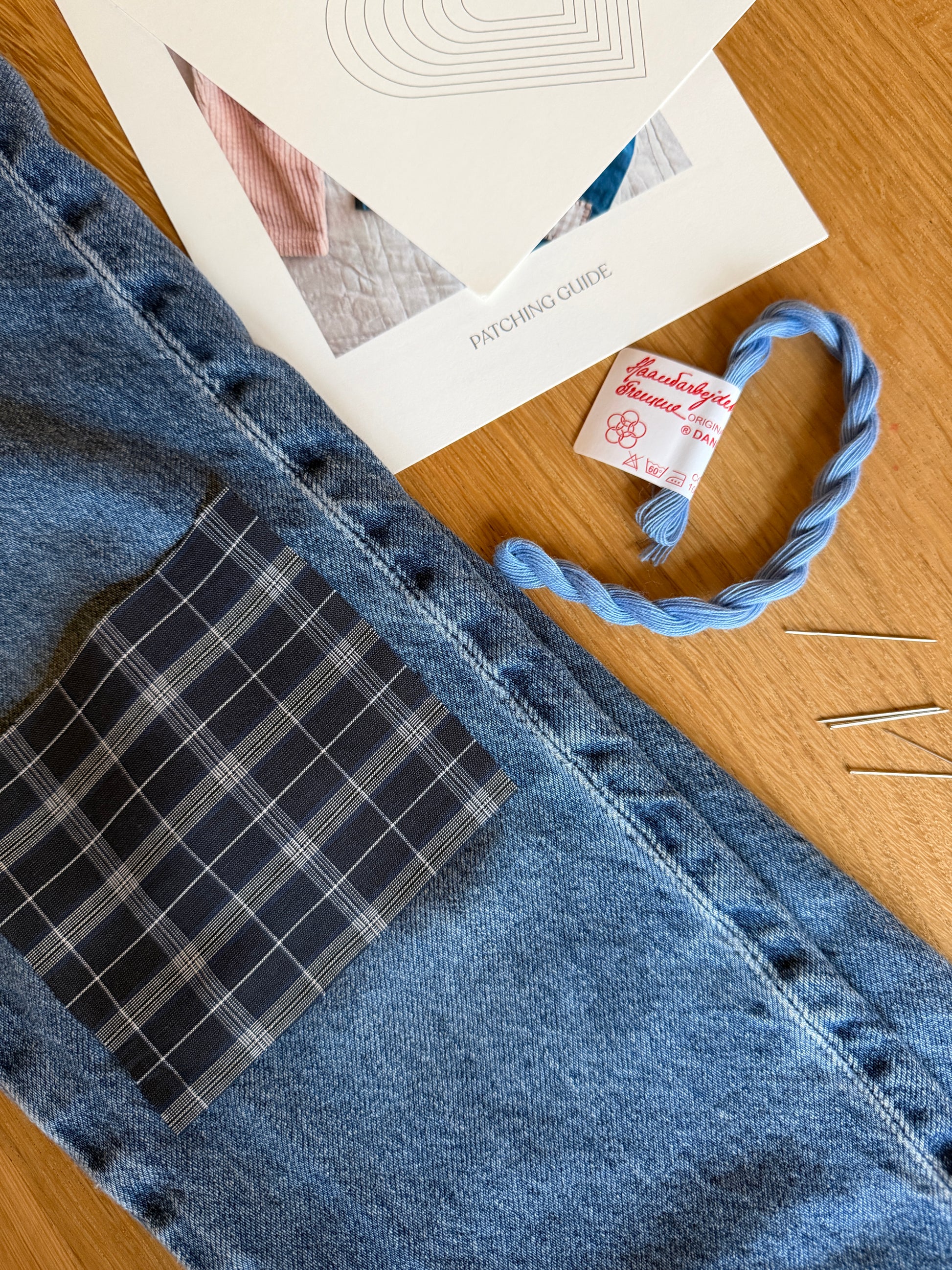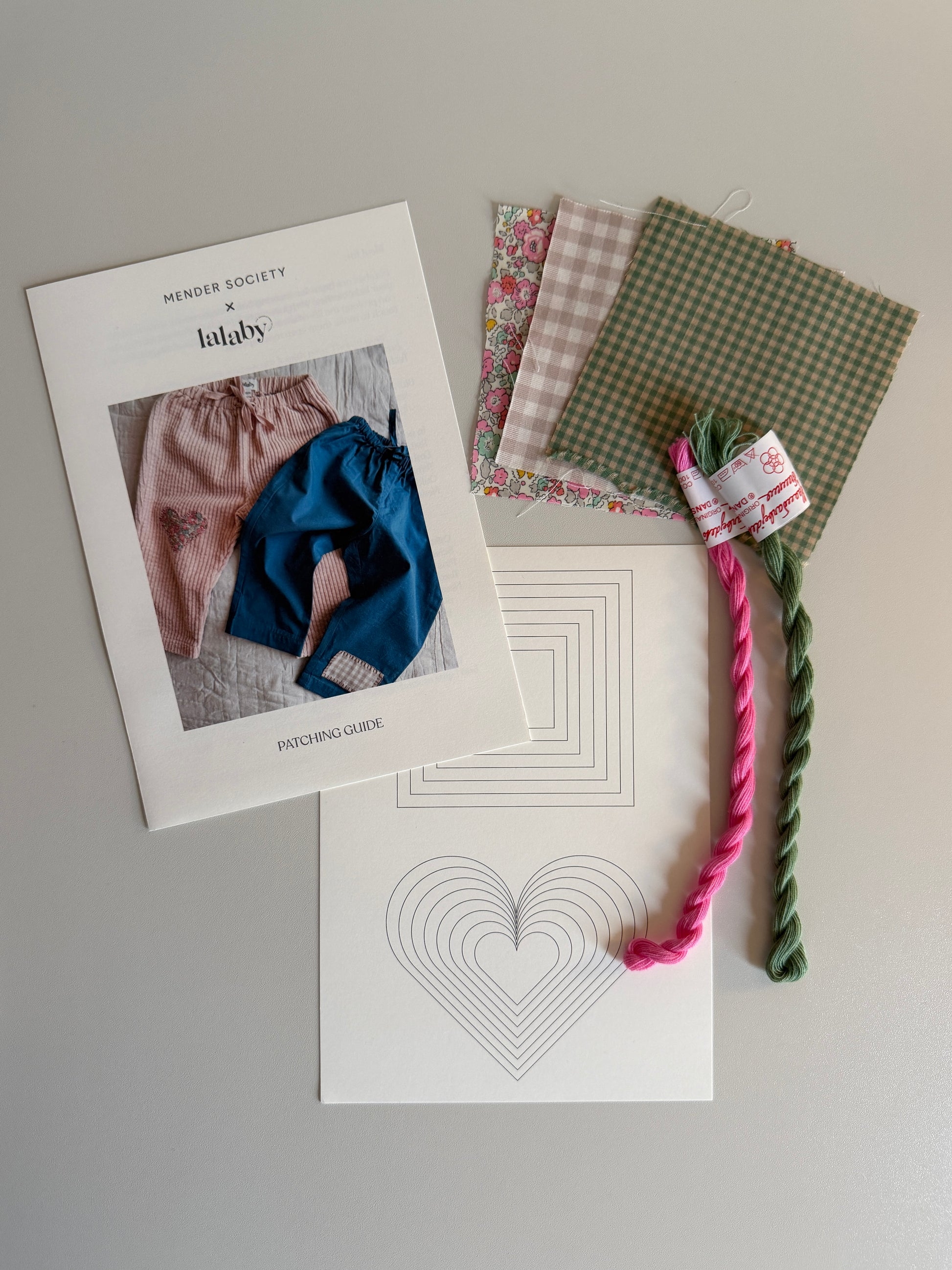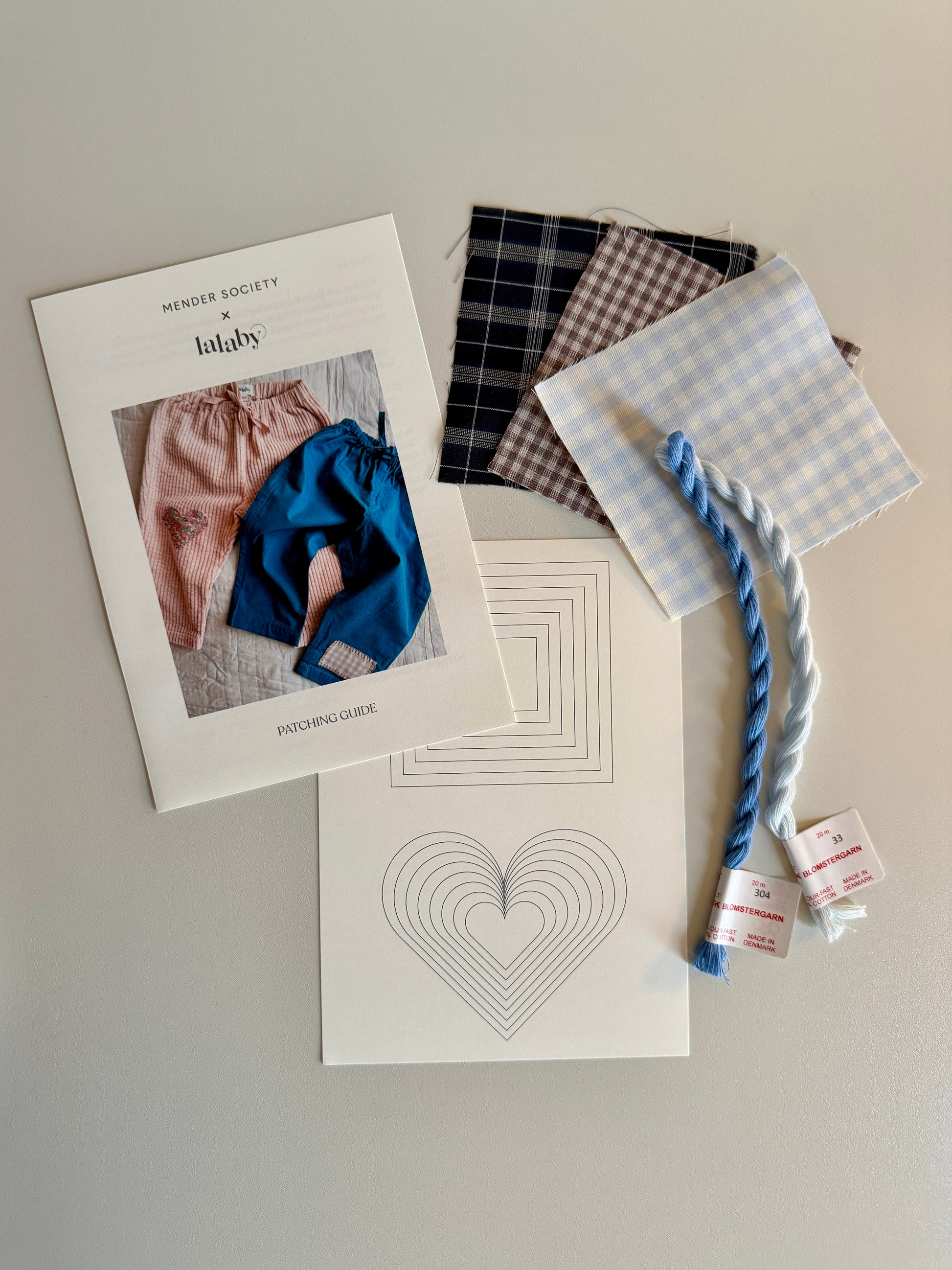 Mender Society har sammen med børnetøjsmærket Lalaby sammensat et lappekit med tekstilrester fra Lalabys egen produktion, som er omsat til lapper, der er helt oplagte til huller på jeans.